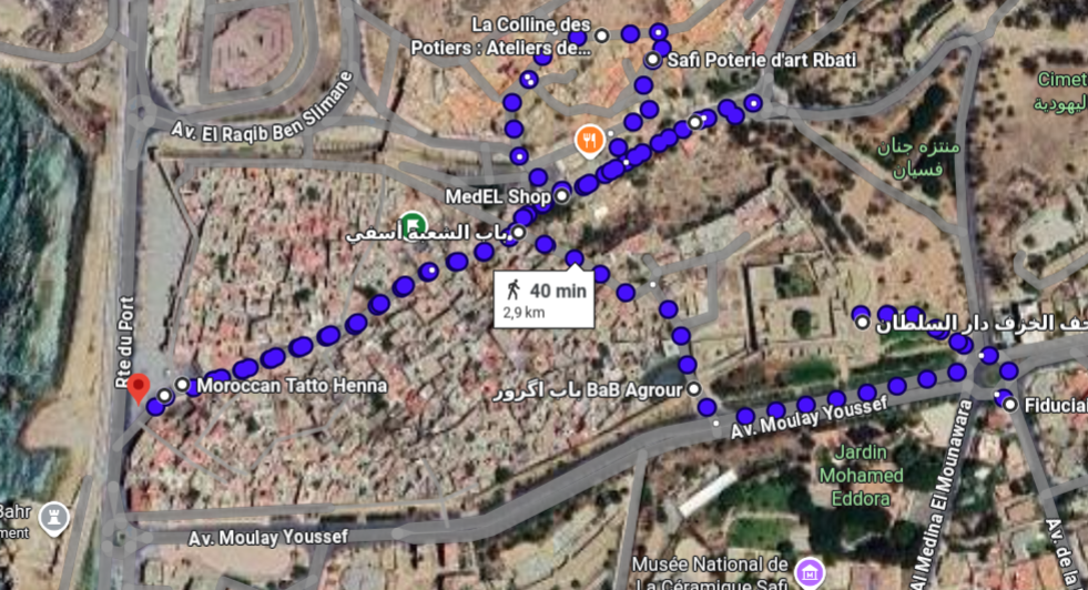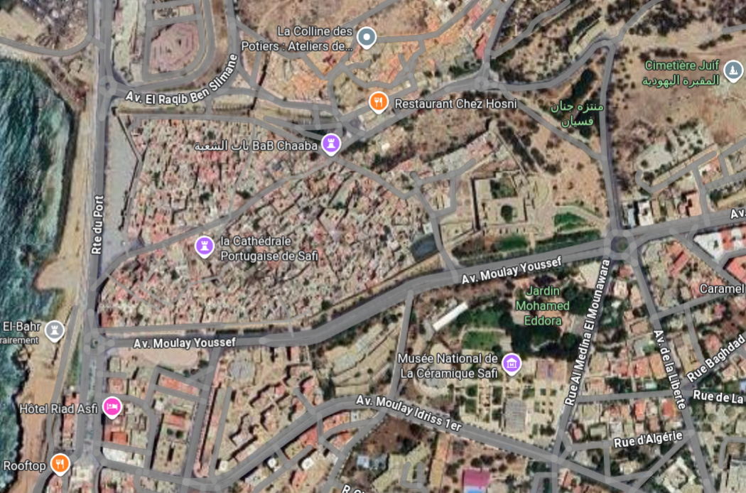 - à Safi, garez vous sur le bas de l'avenue Moulay Youssef et découvrez la médina avec le marché de la poterie (tag vert), monter sur la colline des potiers pour vous initier et terminer la journée avec un petit repas, un jus et le couché de soleil sur l'un des rooftop de la corniche.