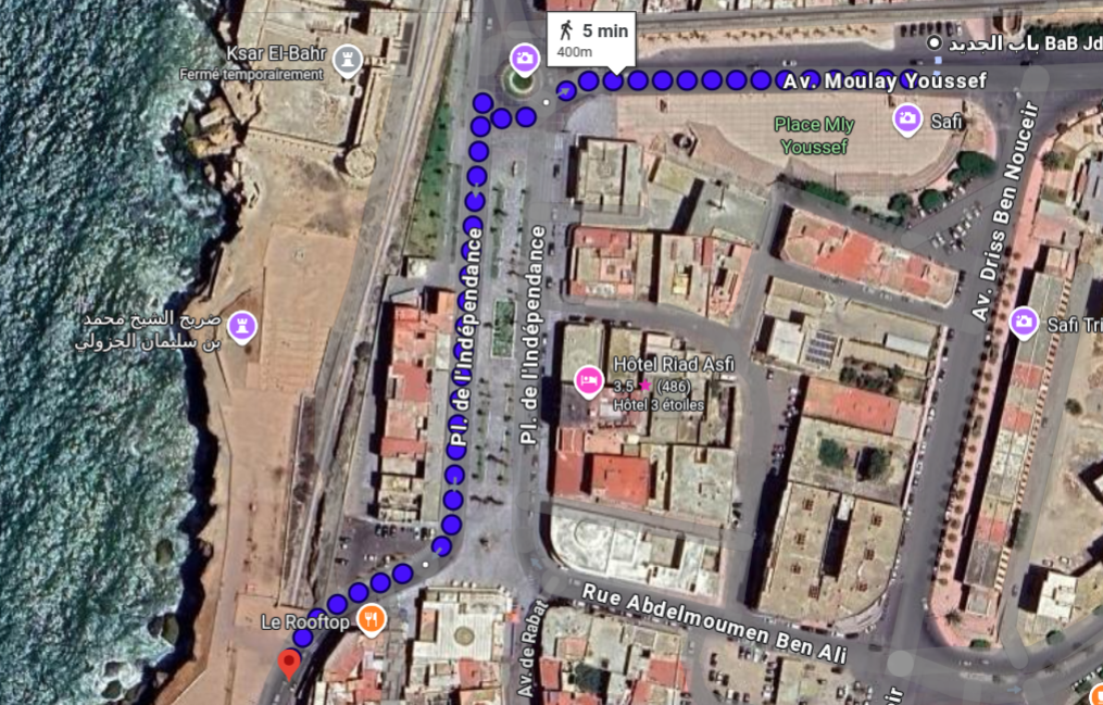- descendez tranquillement depuis le Riad en direction de la cité Portugaise par l'avenue Zertouni,