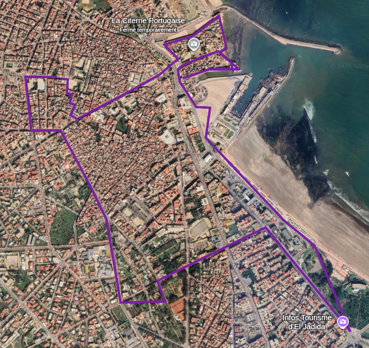 - prenez à gauche, longez la place Labrija et son grand cadran solaire, continuez sur l'avenue Suez jusqu'à la grande plage d'El-Jadida,